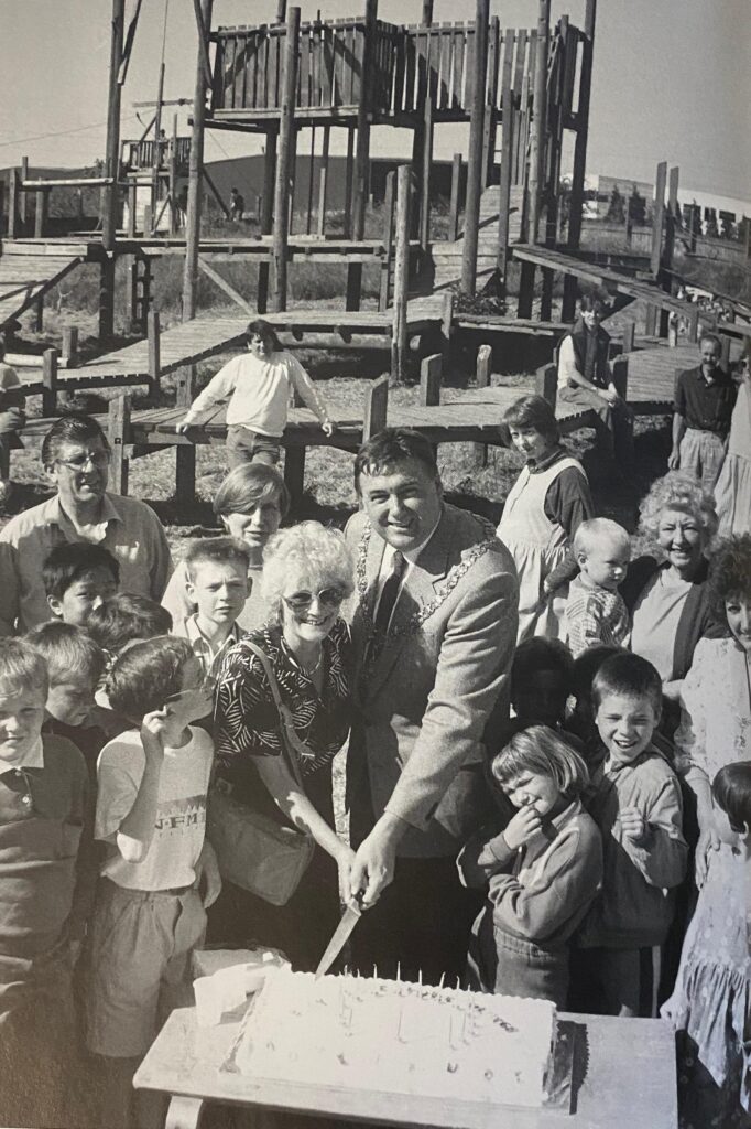 Arbury Adventure Playground celebrating its 16th birthday in 1989. Reproduced with kind permission from the Museum of Cambridge from a book in their collection titled “Memory Lane Cambridge” by Mike Petty and published by Cambridge Evening News 1999, ISBN 1859831842.